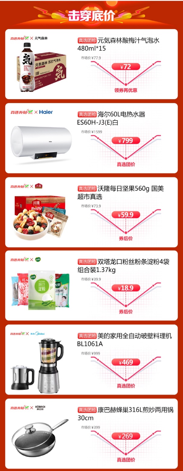 參與真選萬人團(tuán)的產(chǎn)品,大家電如海爾電熱水器,市場價1599元,真選團(tuán)購價低至799元;美的滾筒洗衣機(jī),市場價3599元,真選團(tuán)購價2499元……優(yōu)惠力度非常之大,部分產(chǎn)品優(yōu)惠可超千元。