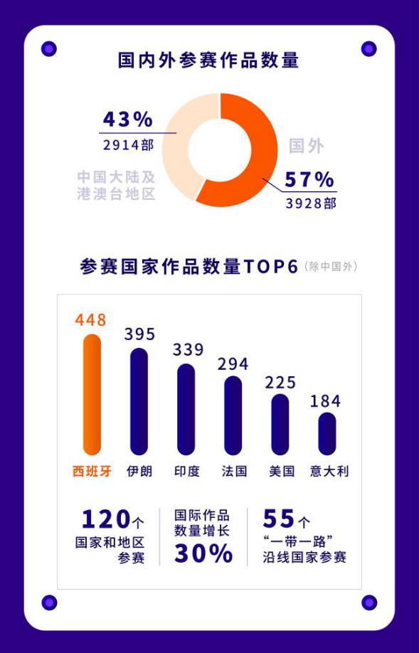 自今年9月中旬全球短片征集啟動(dòng)以來(lái),本屆短片節(jié)獲得來(lái)自世界各地創(chuàng)作者的積極響應(yīng),盡管受到新冠疫情影響以及遭遇影視產(chǎn)業(yè)寒冬,但本屆短片節(jié)參賽作品數(shù)量卻逆勢(shì)而上,并刷新歷史新高。而且,在今年的6842部參賽作品中,國(guó)際參賽作品多達(dá)3928部,數(shù)量較去年增長(zhǎng)30%,占作品總量的57%。在今年參賽的120個(gè)國(guó)家和地區(qū)中,作品數(shù)量位居前六名的國(guó)家分別是西班牙(448部)、伊朗(395部)、印度(339部)、法國(guó)(294部)、美國(guó)(225部)和意大利(184部)。值得一提的是,作為深圳市參與“一帶一路”建設(shè)重點(diǎn)項(xiàng)目,短片節(jié)今年吸引了來(lái)自“一帶一路”沿線的55個(gè)國(guó)家參賽,約占目前65個(gè)“一帶一路”沿線國(guó)家數(shù)的85%,短片節(jié)作為推動(dòng)“一帶一路”沿線國(guó)家間人文交流、促進(jìn)全球跨文化傳播的重要平臺(tái)的作用日益凸顯,國(guó)際化進(jìn)一步走向深入。