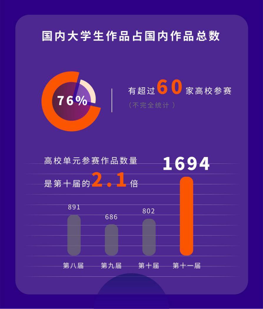 作為參與金鵬短片導(dǎo)演扶持計(jì)劃的重要力量,今年高校大學(xué)生的參賽積極性持續(xù)高漲。本屆短片節(jié)發(fā)起的“全國(guó)大學(xué)生視頻創(chuàng)意大賽”共收到來(lái)自全國(guó)超過(guò)60所高校的1694部參賽作品,數(shù)量同比增長(zhǎng)一倍。國(guó)內(nèi)大學(xué)生參賽作品數(shù)量在所有國(guó)內(nèi)參賽作品總數(shù)中占比58%,大學(xué)生創(chuàng)作者一躍成為金鵬短片導(dǎo)演扶持計(jì)劃的中堅(jiān)力量,凸顯了新時(shí)代下年輕創(chuàng)作者對(duì)短片以及短視頻的無(wú)限熱情和興趣執(zhí)著。大學(xué)生競(jìng)賽單元將分別評(píng)選出“最佳大學(xué)生短片”、“最佳大學(xué)生劇情短片”、“最佳大學(xué)生紀(jì)錄短片”、“最佳大學(xué)生動(dòng)畫短片”、“最佳大學(xué)生VLOG短片”、“最佳大學(xué)生科普短片”、“最佳大學(xué)生廣告創(chuàng)意短片”、“最佳大學(xué)生原創(chuàng)音樂(lè)短片”等9大類型入圍優(yōu)秀作品。