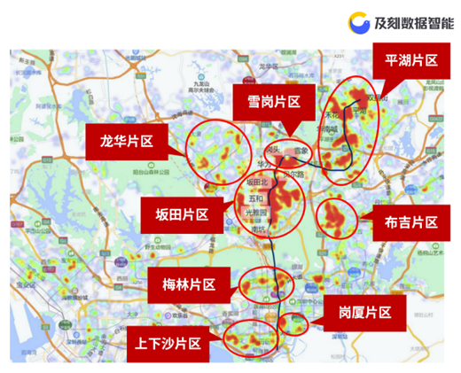 從熱力圖中可以看出,10號線客流集中居住在三大片區(qū):平湖、雪崗、坂田,深圳地鐵10號線的開通,結(jié)束了三大片區(qū)內(nèi)多數(shù)區(qū)域不通地鐵的歷史,這三個大片區(qū)的居民成為了10號線的主力乘客。