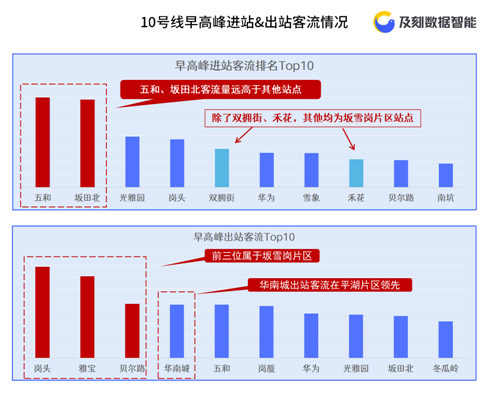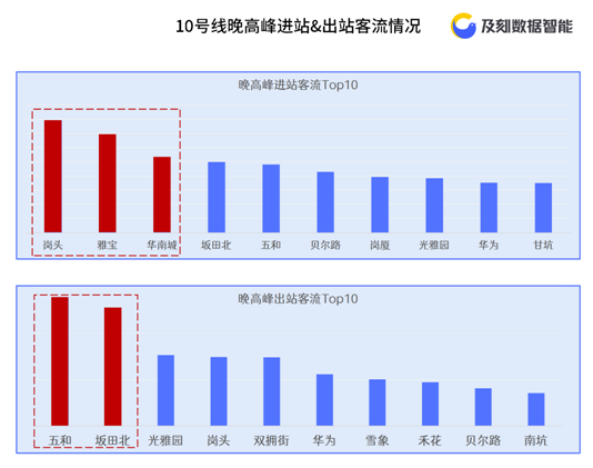 早高峰(6-10點(diǎn))進(jìn)站客流Top10站點(diǎn)中,坂雪崗片區(qū)占據(jù)8席,反映其周邊區(qū)域聚居著眾多的上班族。其中,五和、坂田北進(jìn)站客流遙遙領(lǐng)先其他站點(diǎn)。