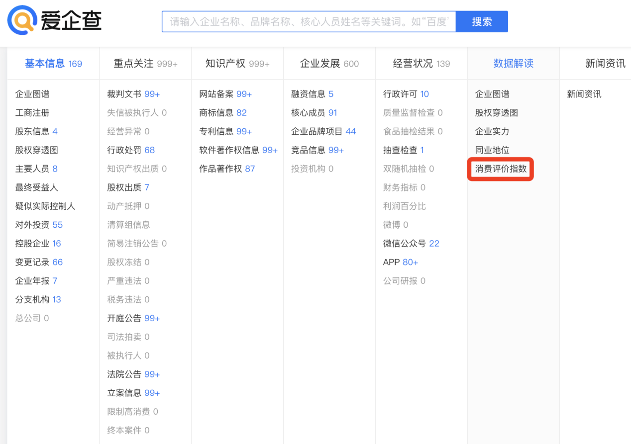 “愛企查”企業(yè)消費評價指數查詢流程: