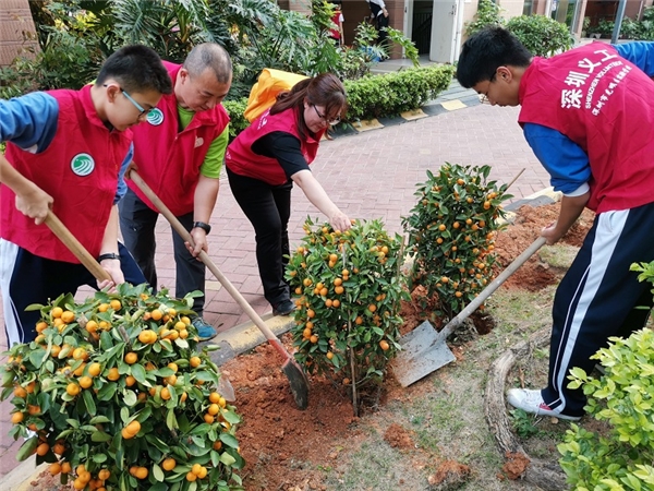 雍景城小區(qū)作為本次活動的主會場,現(xiàn)場熱鬧非凡。公明街道相關(guān)工作人員向光明區(qū)實(shí)驗(yàn)學(xué)校師生、志愿者、物業(yè)等講解年花年桔回植活動的意義及安全事項(xiàng),并分成三組開始種植活動,大家你扶綠植我培土,你摘果桔我澆水,揮灑辛勤的汗水,很快,70多棵年桔就“立”起來了,枝干上掛滿了種植人員留下的真切的寄語。東明公寓、傳麒山小區(qū)的種植現(xiàn)場同樣溫馨而快樂。