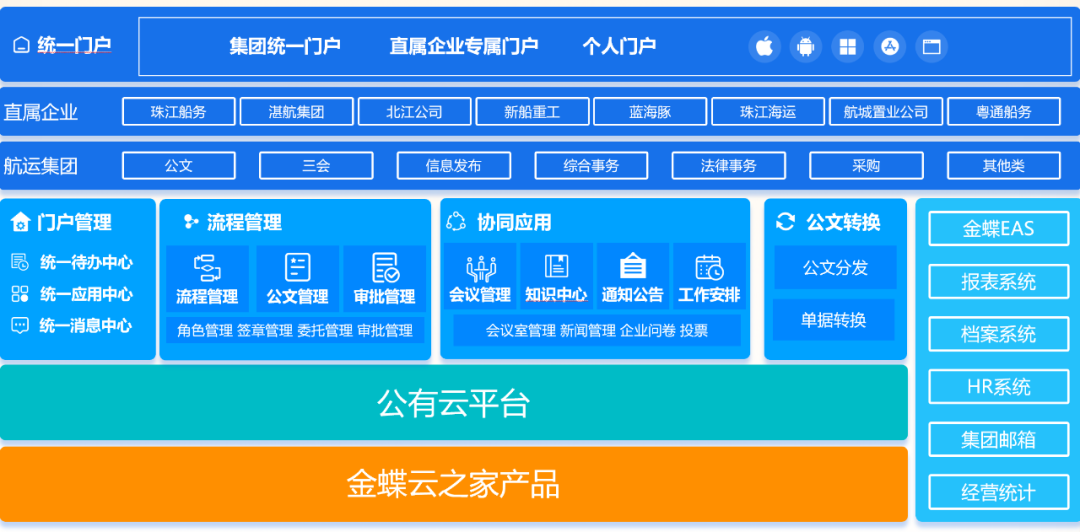 作為大型綜合性國企,廣東航運(yùn)集團(tuán)現(xiàn)有直屬企業(yè)8家,擁有全資、控股、參股及代理水路客運(yùn)港口13家,經(jīng)營和管理96艘粵港澳高速客船。伴隨經(jīng)營規(guī)模的發(fā)展、技術(shù)迭代、應(yīng)用場景深入,其信息化需要一個(gè)可以覆蓋集團(tuán)協(xié)同應(yīng)用場景的綜合辦公平臺,而集團(tuán)原有的OA已經(jīng)無法滿足航運(yùn)的持續(xù)發(fā)展需要。