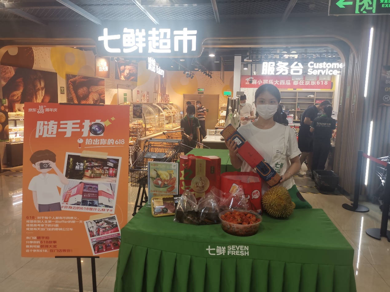 在七鮮超市不僅能盡情吃喝,還能參與到京東618的線下“隨手拍”活動。一直到6月18日,前往任意一家京東線下門店,拍攝帶有京東618創(chuàng)意元素的照片,參與與京東微博話題互動,就有機會獲得華為Mate 40 Pro、五菱宏光MINI EV等豪華大獎。