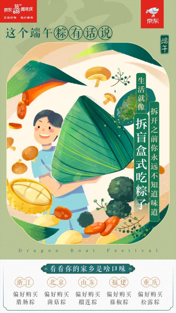 此外,京東自有品牌京東京造原創(chuàng)設計產出的一款國潮包裝的粽子禮盒,在這個端午節(jié)也受到了消費者的極大歡迎。產品包裝上,傳統(tǒng)龍舟競逐插畫所演繹出的國潮美學,正呼應了傳統(tǒng)風尚的迅速崛起,而別出心裁的原創(chuàng)禮盒設計,則實現(xiàn)了精準創(chuàng)新,滿足了更年輕的消費者個性。