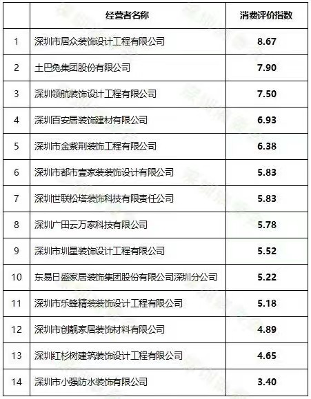 深圳市消委會數(shù)據(jù)顯示,在對2020年4月1日至2021年3月31日期間深圳注冊并有一定市場占有率的14家裝飾裝修經(jīng)營者進行消費評價指數(shù)排名后發(fā)現(xiàn),14家經(jīng)營者均已建立投訴處理和解通道,消費評價指數(shù)平均值為5.98分,大部分企業(yè)能快速響應消費者投訴且處理成功率較高,體現(xiàn)了經(jīng)營者對消費者的重視程度較高,降低了消費者的維權成本。