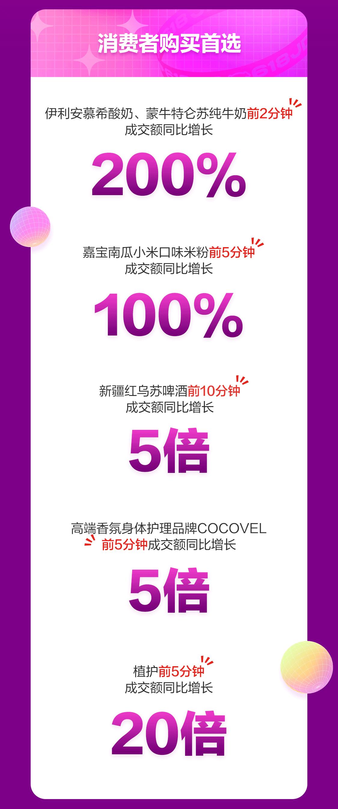 6月18日開場前5分鐘,食品知名品牌增勢明顯。蒙牛前5分鐘成交額同比增長超200%,福臨門前10分鐘成交額同比增長112%,伊利前5分鐘成交額同比增長超200%,其中伊利安慕希酸奶、蒙牛特侖蘇純牛奶兩款爆品前2分鐘成交額同比增長200%。
