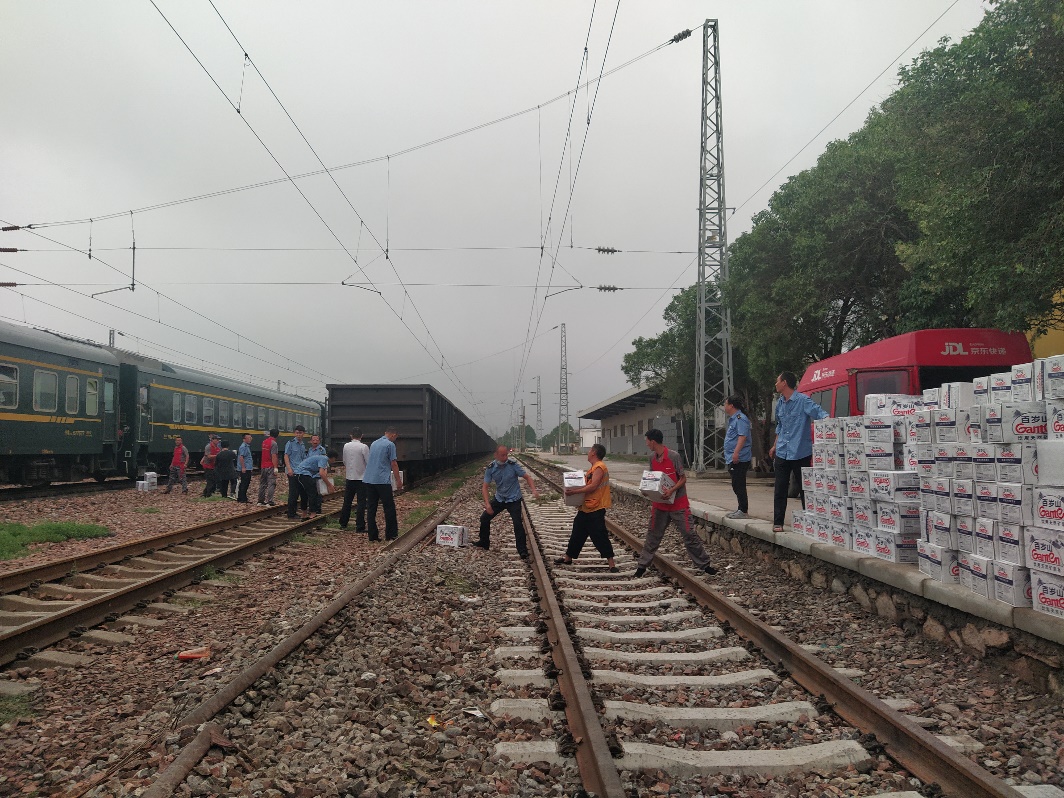 在第二批物資車隊(duì)駛出倉(cāng)庫(kù)的同時(shí),第三批滿載540多箱食品和礦泉水的京東物流車涉水抵達(dá)K226/7次列車臨時(shí)??康泥嵵蓁F爐站,為仍在滯留的數(shù)百名旅客送去應(yīng)急物資。