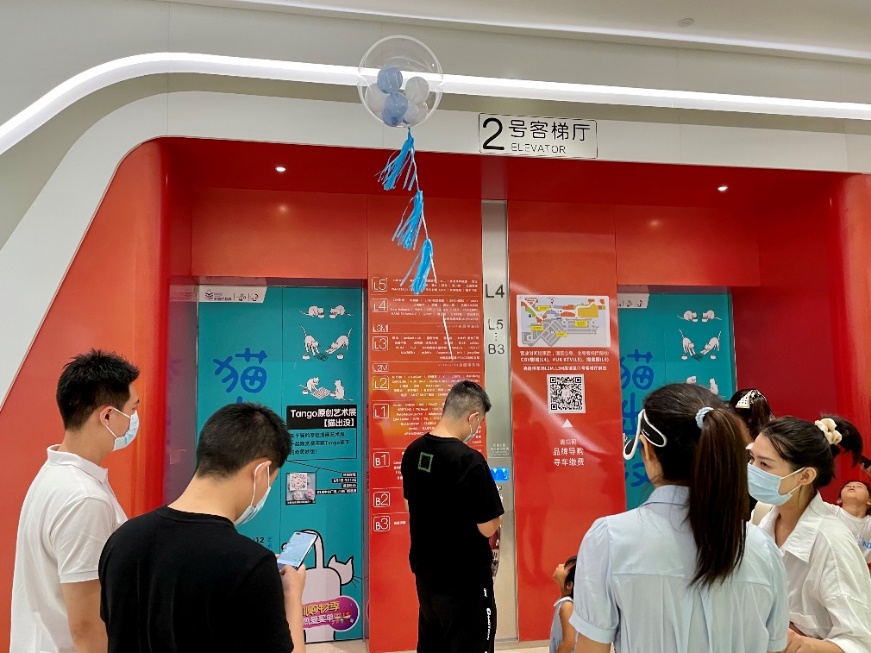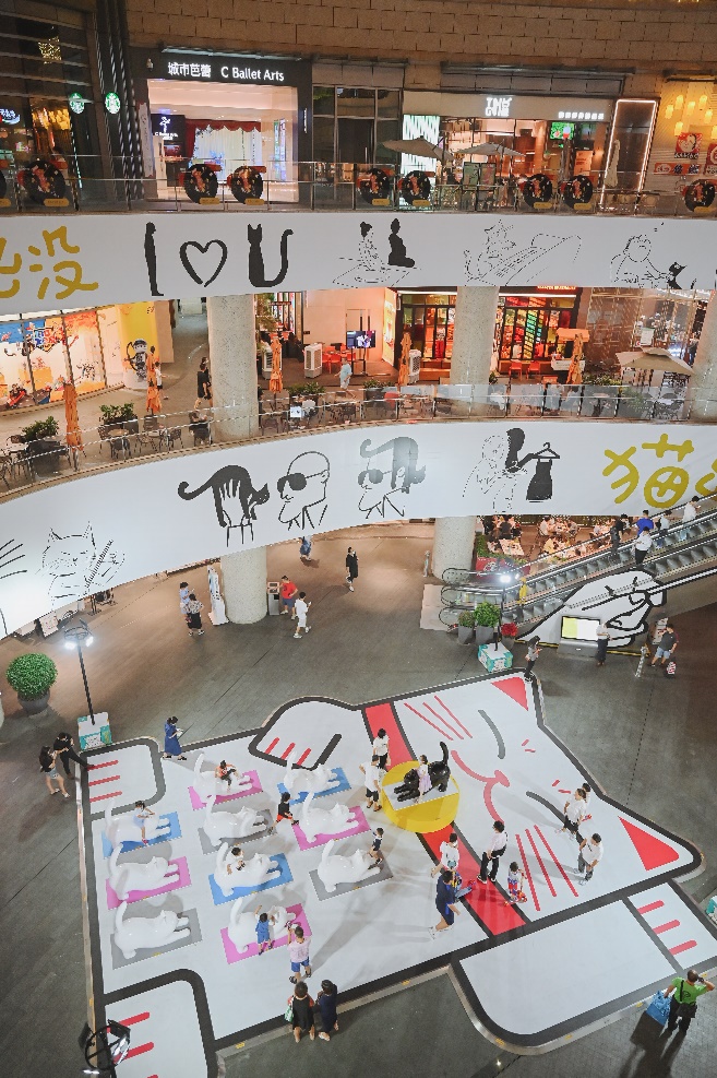 以壹方城為大型展廳,打造巨型貓瑜伽互動點(diǎn)(B1中心廣場)及巨型漫畫打卡墻 (小米通道前 ),全場還閃現(xiàn)各種創(chuàng)意貓貓漫畫貼紙,包括玻璃圍欄、店鋪櫥窗、電梯門,甚至是小小垃圾桶也有細(xì)節(jié)設(shè)計,沉浸式的“吸貓”逛展體驗,讓人獲得滿滿療愈之感。不得不說,貓出沒 ·tango藝術(shù)特展實(shí)屬匠心之作,氛圍感和體驗感極佳。