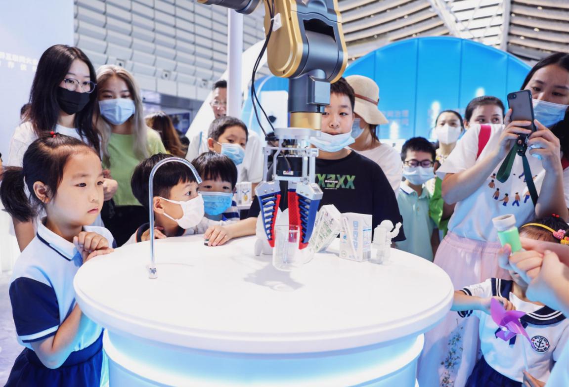這牛奶和其他的不太一樣,很香濃?!半x心精萃‘白科技’開啟臻濃新紀元”展臺一直就是博覽會現(xiàn)場的“人氣王”,這里以宇宙探索為主題,科幻感十足,火箭發(fā)動機噴出淡淡煙霧,三臺智能機械臂不停忙碌,人們排起長隊,品嘗由“離心精萃科技”現(xiàn)場調(diào)制的伊利臻濃牛奶。在這里,吸引觀眾的不僅是美味的伊利牛奶,也有滿滿的數(shù)字科技。