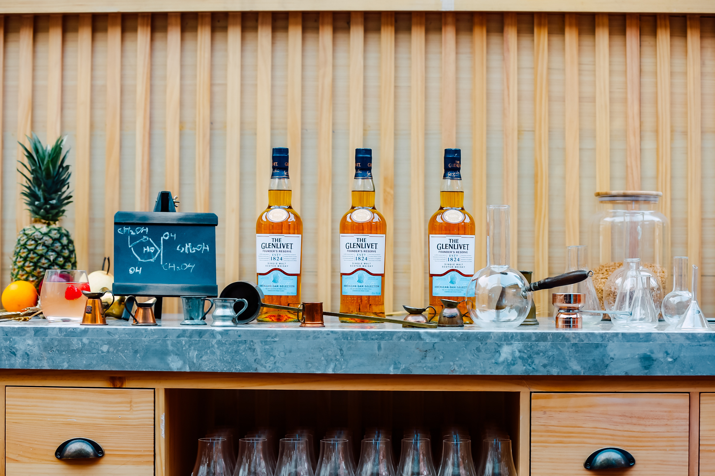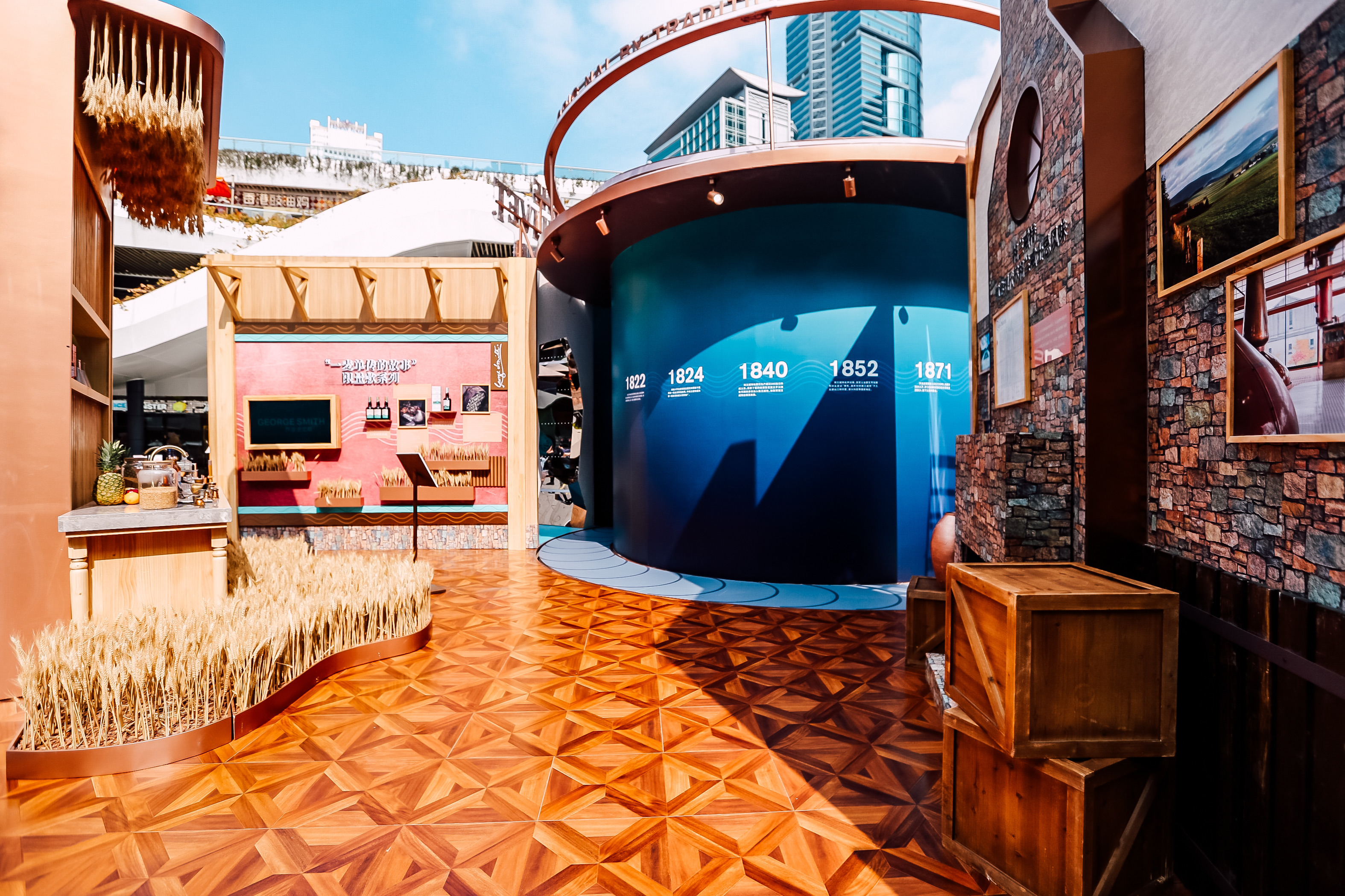 時(shí)光穿梭酒廠入口以“破墻而出”的投影裝置為來賓開啟時(shí)光隧道的大門,極具震撼力的視覺畫面展現(xiàn)格蘭威特打破傳統(tǒng)、大膽顛覆的創(chuàng)新精神,一段奇妙的旅程便由此開啟。踏上傳送帶,來賓首先抵達(dá)還原了一間復(fù)古簡(jiǎn)陋的茅草屋的“創(chuàng)始人蒸餾室”,作為格蘭威特的發(fā)源地,品牌創(chuàng)始人喬治·史密斯先生百年前便在此秘密蒸餾了首批格蘭威特單一麥芽威士忌。古樸的木質(zhì)操作臺(tái)上擺放著調(diào)配實(shí)驗(yàn)中所需的各種儀器,灰磚墻面上展示著酒廠各時(shí)期的歷史照片,列架上則陳列了向喬治 ·史密斯先生致敬的創(chuàng)始人甄選單一麥芽威士忌,帶領(lǐng)威士忌愛好者們跨越時(shí)空回顧專屬格蘭威特的傳奇歷史和傳承。值得一提的是,繼12年秘密蒸餾發(fā)布后,格蘭威特“一麥單傳的故事”限量系列中的第二款全新杰作——12年創(chuàng)始佳釀限量版也在此處正式亮相。采用“初填雙橡木桶威士忌”制作理念,這款佳釀以其特有的宜人果香為原始的斯佩塞威士忌賦予了全新風(fēng)味。格蘭威特以此紀(jì)念喬治?史密斯先生成為當(dāng)?shù)芈氏全@得威士忌制作許可的蒸餾師的傳奇歷史,向其敢為人先的勇氣致敬。