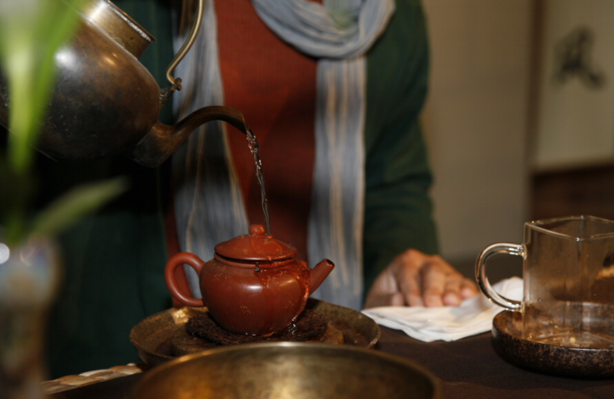 周三茶會(huì)的經(jīng)行禪茶創(chuàng)始人汪林生在進(jìn)行禪茶表演