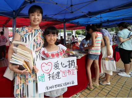 深圳市錦田小學(xué)的部分學(xué)生家長組團(tuán)從羅湖趕至活動現(xiàn)場,他們帶來了200余本書,剛一擺出來,展區(qū)前就圍滿了人?!霸诹私獾竭@次愛心捐書活動后,我們特意從學(xué)生捐獻(xiàn)的書籍中精心挑選出200余本帶到現(xiàn)場。捐書活動與我們的教學(xué)理念很契合,我們愿意讓孩子積極參與,在他們幼小的心靈播下愛的種子,在成長的道路上時刻不忘幫助他人?!卞\田小學(xué)劉向陽副校長告訴記者。