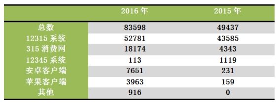 2016年,深圳市、區(qū)消委會(huì)共接受消費(fèi)者投訴83598宗,比2015年的49437宗增長(zhǎng)了69.10%,為消費(fèi)者挽回?fù)p失2.1億元。其中,52781宗來源于12315系統(tǒng),占63.13%;“315消費(fèi)通”的網(wǎng)頁(yè)端、手機(jī)端、微信端已經(jīng)成為另一消費(fèi)者投訴主渠道,全年共接收消費(fèi)者投訴30552宗,占36.55%,比去年的9.57%提高了27%。如表1所示。
