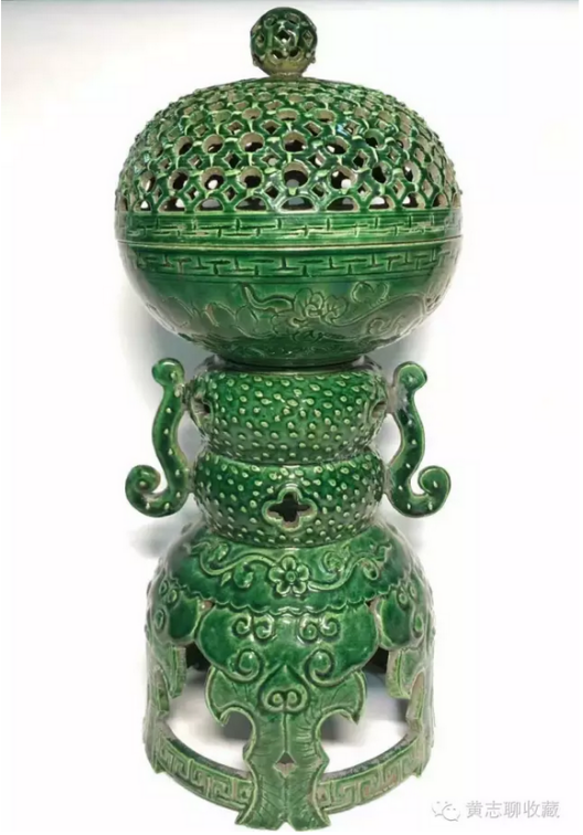 香薰在古代是頗為流行的室內(nèi)陳設(shè)用器,形制多樣,材質(zhì)不一。漢唐時(shí)期出土的香薰眾多,如有名的漢代博山爐,唐代香薰球等。兩宋時(shí)期,實(shí)行文人治國(guó),香具更是盛行,影響所及,同時(shí)并存的遼、金兩朝也頗為風(fēng)行。當(dāng)然,香具中也區(qū)分宅舍用及寺廟用、宮殿用等。其中寺廟及宮殿用品多為成對(duì)擺放,講究對(duì)稱之美,顯得莊重大方。而宅舍之用更為推崇雅致,趣味。下面介紹的這件綠釉香薰應(yīng)為遼金時(shí)期的寺廟用品。 香薰高31.5cm、直徑14.5cm,整體呈豆式。豆是先秦禮器,用以在祭祀、宴饗中盛放肉食。在家廟祭祀中,豆是不可或缺的禮儀用具,早期豆用竹編成,后用青銅鑄造,因此在禮書中稱“籩豆”。此對(duì)香薰延續(xù)了青銅豆的大體形制,上作球形,香盤半圓,蓋為鏤空半圓,扣合后渾然如一。香盤可拆卸,安插于支座上。座上部為雙扁圓狀疊壓,兩側(cè)裝飾螭龍耳;下部呈鏤空裙擺式,承以托泥,穩(wěn)重大方。通體施綠釉,釉面潤(rùn)澤,純凈自然。器身點(diǎn)綴穿花龍紋,如意紋,加之裙擺上的龕形開光,推測(cè)為當(dāng)時(shí)高等級(jí)的寺廟的佛前薰香供器。 欣賞更多藏品,歡迎瀏覽【黃志博物館】網(wǎng)站。 我們會(huì)介紹更多的收藏知識(shí)、推薦更多優(yōu)質(zhì)優(yōu)價(jià)的藏品供您了解和選擇,也歡迎您把這些分享給朋友們,讓大家一起來了解歷史文化、體會(huì)收藏的快樂!