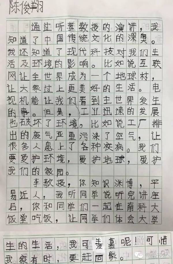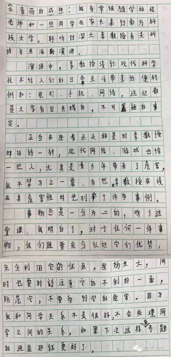 近日,多位小朋友特地就這次講座表達感想。他們紛紛盛贊講座深刻,令其受益匪淺,“深受感動”。他們紛紛在感想里提到李教授平易近人,講課精彩,更在聽完李教授的課后開始反思現(xiàn)代科技與當代生活,提升自身思想和文化水平。