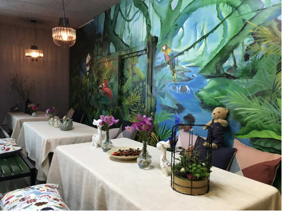 還有那漫山遍野的鮮花和蔬菜,是這個花園里最美的風景線,還有那清晨中薄薄的霧,和那湛藍的天空,給這個花園做了最棒的裝飾,跟著香味,我走進了一個童話房門,墻壁上畫滿了森林和動物,桌子上擺滿了各式各樣的小燈,瓶子和香氣撲鼻的鮮花、干花,香極啦!看著這仙境般的地方,臉上總會不由自主地浮起笑容!
