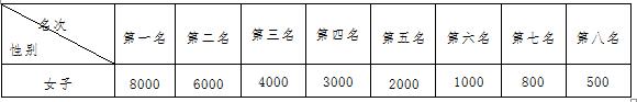 根據(jù)槍聲計(jì)時(shí)成績(jī)錄取女子第一名至第五十名運(yùn)動(dòng)員現(xiàn)場(chǎng)頒發(fā)獲獎(jiǎng)證書,前八名并分別獲得獎(jiǎng)金(單位:人民幣元),前三名另外頒發(fā)獎(jiǎng)杯一座、完賽獎(jiǎng)牌一枚、領(lǐng)獎(jiǎng)服裝一套。