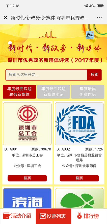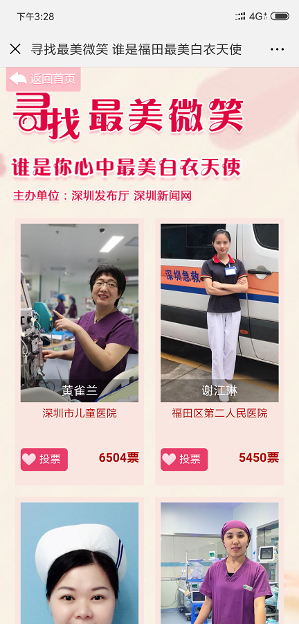 ② 多個(gè)投票活動(dòng)已經(jīng)形成良好群眾效應(yīng),合作方主辦方多屆舉辦,每屆舉辦均由深圳新聞網(wǎng)負(fù)責(zé)投票系統(tǒng)開發(fā),例如:健康場所投票、集團(tuán)攝影大賽評(píng)選投票、政務(wù)類投票。形成了良好品牌效應(yīng)和示范,往往一個(gè)區(qū)舉辦的投票活動(dòng)其他區(qū)會(huì)跟進(jìn)舉辦,形成系列投票,例如:“最美護(hù)士”系列投票,“最美醫(yī)生”系列投票,“最美教師”系列投票,“最佳政務(wù)”系列投票等;