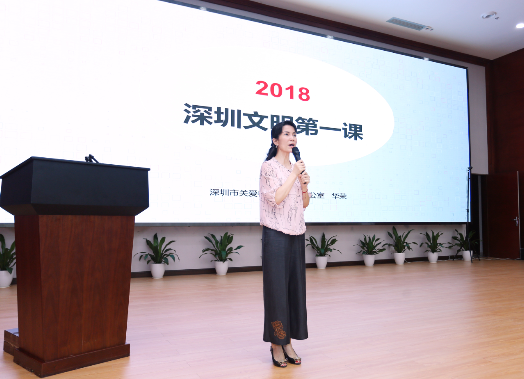 深圳市關(guān)愛辦副主任華榮以詳實的數(shù)據(jù)和感人的視頻講述文明第一課