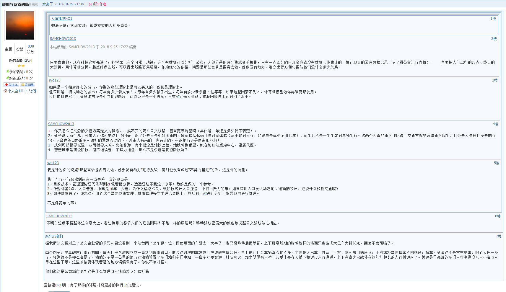 9月25日有市民在深圳論壇以《關(guān)于公交線路規(guī)劃和站臺(tái)設(shè)置的一點(diǎn)建議》為題發(fā)帖,自稱是曾經(jīng)的公交人和現(xiàn)在的私家車駕駛員,對(duì)深圳的公交出行一口氣提出3個(gè)意見。帖文中最為吸引人眼球的觀點(diǎn)就是“將全市各站點(diǎn)進(jìn)行編號(hào),采用計(jì)算機(jī)技術(shù),對(duì)編號(hào)站點(diǎn)進(jìn)行排列組合,每個(gè)方向連續(xù)的10個(gè)站點(diǎn)有三條線路覆蓋,超出三條屬于線路密度高或規(guī)劃不合理?!眴芜@一句話就在跟帖中引發(fā)了針鋒相對(duì)的辯論,有支持的市民認(rèn)為:主意不錯(cuò),實(shí)現(xiàn)起來應(yīng)該也難度不大?,F(xiàn)在不是整天提什么物聯(lián)網(wǎng)、大數(shù)據(jù)、智慧城市么,這個(gè)不就是這些高新技術(shù)在公交出行方面的應(yīng)用。不看好的市民則認(rèn)為:目前技術(shù)、管理理論還無法做智能分析,遠(yuǎn)遠(yuǎn)還達(dá)不到這個(gè)水平,“最多是做為一個(gè)參考”。