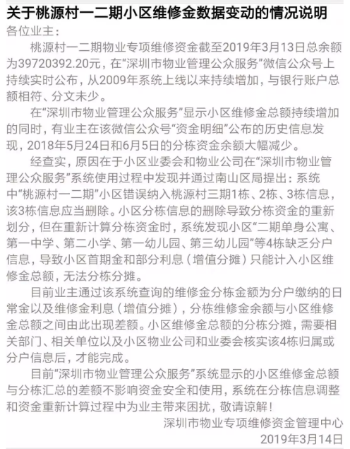 3月18日,南山區(qū)住房和建設(shè)局通過(guò)深圳論壇進(jìn)行公開(kāi)回應(yīng),稱經(jīng)向市物業(yè)專項(xiàng)維修資金管理中心查詢,原因在于桃源村三期1棟、2棟、3棟信息刪除及分棟資金的重新劃分,以致小區(qū)首期維修金和部分利息(增長(zhǎng)分?jǐn)偅┲荒苡?jì)入小區(qū)維修金總額,無(wú)法分棟分?jǐn)偂?/span>