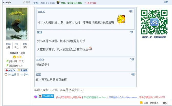記者從問政平臺得知,5月底以來,還有市民發(fā)帖反映,除華潤萬家外,科技園萬象天地華潤Ole、僑香路沃爾瑪?shù)瘸幸泊嬖诓惶峁┘堎|(zhì)購物小票的情況。目前,市民仍然普遍認同超市應主動提供紙質(zhì)購物小票,避免顧客被價格欺詐。有市民表示:“遇到最多的是優(yōu)惠打折,實際還是原價買單,這時,手中有小票一目了然,不花冤枉錢。”還有市民質(zhì)疑,“奸商,動不動就打著環(huán)保這些高大上的理由作借口”。同時,也有市民體驗過微信小票后表示,“沃爾瑪手機掃碼付款是沒有紙票,購物小票藏在微信公眾號里,退換貨就在那里面進行。這就是科技發(fā)達帶來的豐碩成果,挺好的?!苯刂劣浾甙l(fā)稿時,市民關于科技園萬象天地華潤Ole、僑香路沃爾瑪?shù)瘸胁惶峁┵徫镄∑钡奶倪€沒有得到相關部門回應。