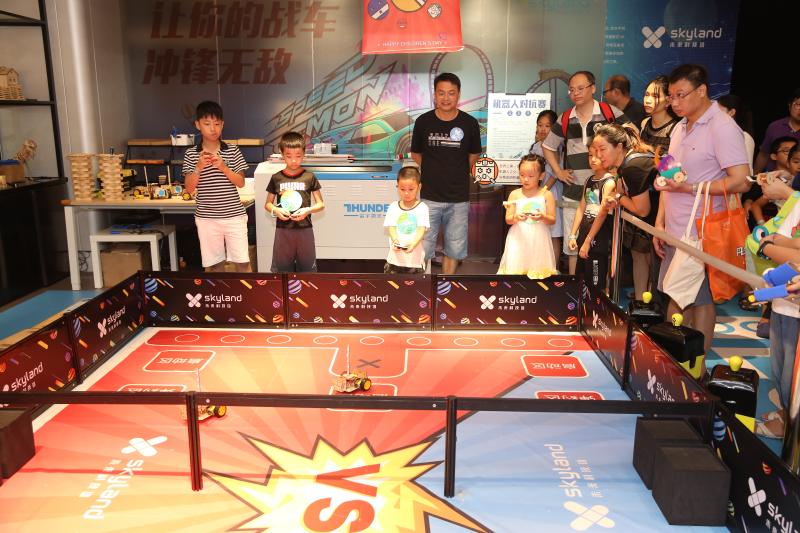 “我跟你說噢,那邊吹出來的泡泡能把我們倆都包進(jìn)去!”“老媽,原來空氣的形狀是圓環(huán)形的呀……”歡聲笑語中,十幾項(xiàng)科技趣味項(xiàng)目讓小朋友們眼花繚亂、目不暇接,這其中,機(jī)器人對抗賽無疑是人氣最高的。賽場上,小朋友們分為紅藍(lán)兩隊(duì),手持遙控器在兩側(cè)站好?!靶∨笥褌冏⒁饫玻恳晃粰C(jī)器人身上有一個(gè)藍(lán)色燈柱,碰撞擋板被撞到后,燈柱長度會縮短……”老師一邊在“戰(zhàn)場”中擺放機(jī)器人,一邊為孩子們詳細(xì)講解規(guī)則。一聲哨響,紅藍(lán)兩隊(duì)的“機(jī)器人大戰(zhàn)”拉開了帷幕,孩子們操控著自己的戰(zhàn)車,左右閃躲,時(shí)而用一個(gè)漂亮的側(cè)移甩掉追擊者,時(shí)而全力沖擊消耗對方的“藍(lán)條”。賽場邊的家長們似乎比小選手更為緊張,他們時(shí)不時(shí)俯下身子,為孩子們出謀劃策:“小超你看,邊上那個(gè)三號車藍(lán)條快沒了,快趕過去補(bǔ)一下!”一位父親看到了打破僵局的好機(jī)會,急忙提醒道,小朋友則心領(lǐng)神會,熟練的操縱著機(jī)器人貼了上去……經(jīng)過一番努力,在成功拿下這寶貴的一分后,小朋友回頭與自己的老爸相視一笑,父子二人之間的默契,在這一刻體現(xiàn)的淋漓盡致。