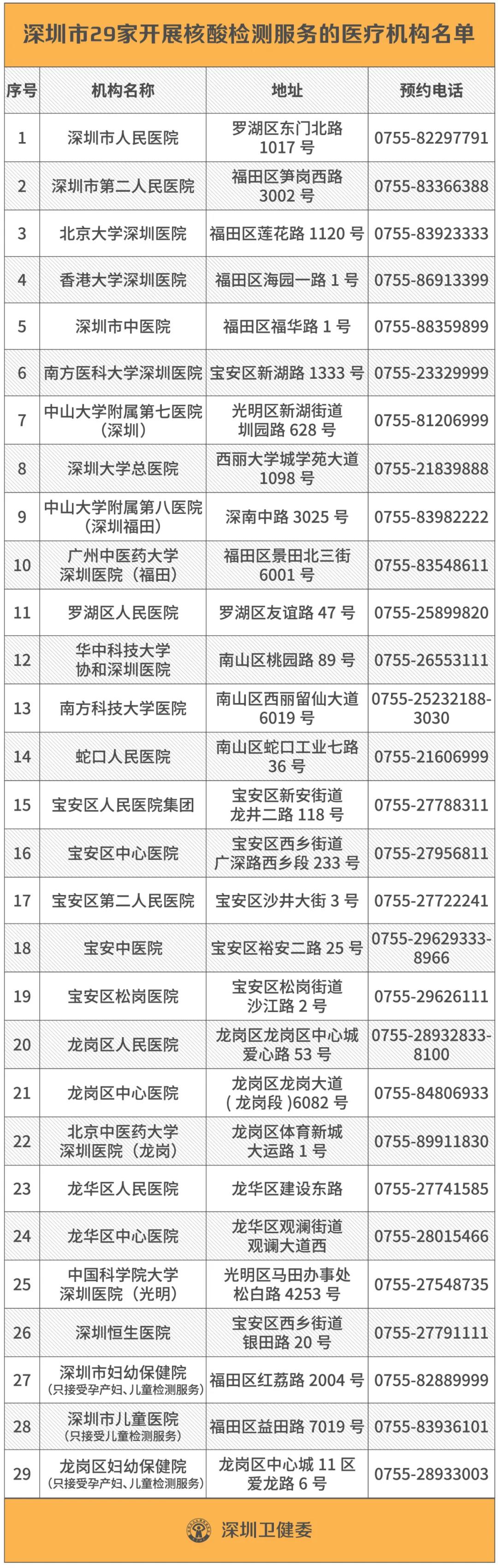 跨境學生可聯(lián)系全市提供核酸檢測的29家醫(yī)療機構(gòu)(詳見附件,含醫(yī)院名稱、地址和聯(lián)系電話)中的任意一家進行檢測,部分醫(yī)院有預約要求,部分醫(yī)院對檢測服務時間有限定,因此首次前往檢測前,請先拔打聯(lián)系電話了解醫(yī)院是否需要預約和服務時間安排。