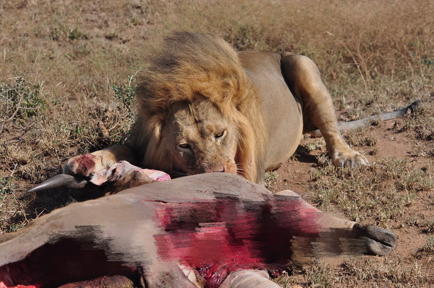 作者運(yùn)氣不錯(cuò),在塞倫蓋蒂巡游時(shí)巧遇一頭雄獅守護(hù)在一頭被咬死的大羚羊旁。李仁奇 攝