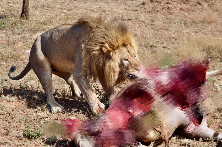 這頭估計(jì)重達(dá)二、三百斤的大羚羊是早晨被三頭雌獅捕獲的,雄獅趕到后,雌獅們各自撕扯一塊肉到遠(yuǎn)處享用去了。雄獅腹中饑餓,不顧乘坐兩臺(tái)越野車的十位游客近在咫尺,只管用力撕咬拖拽羚羊尸體。李仁奇 攝