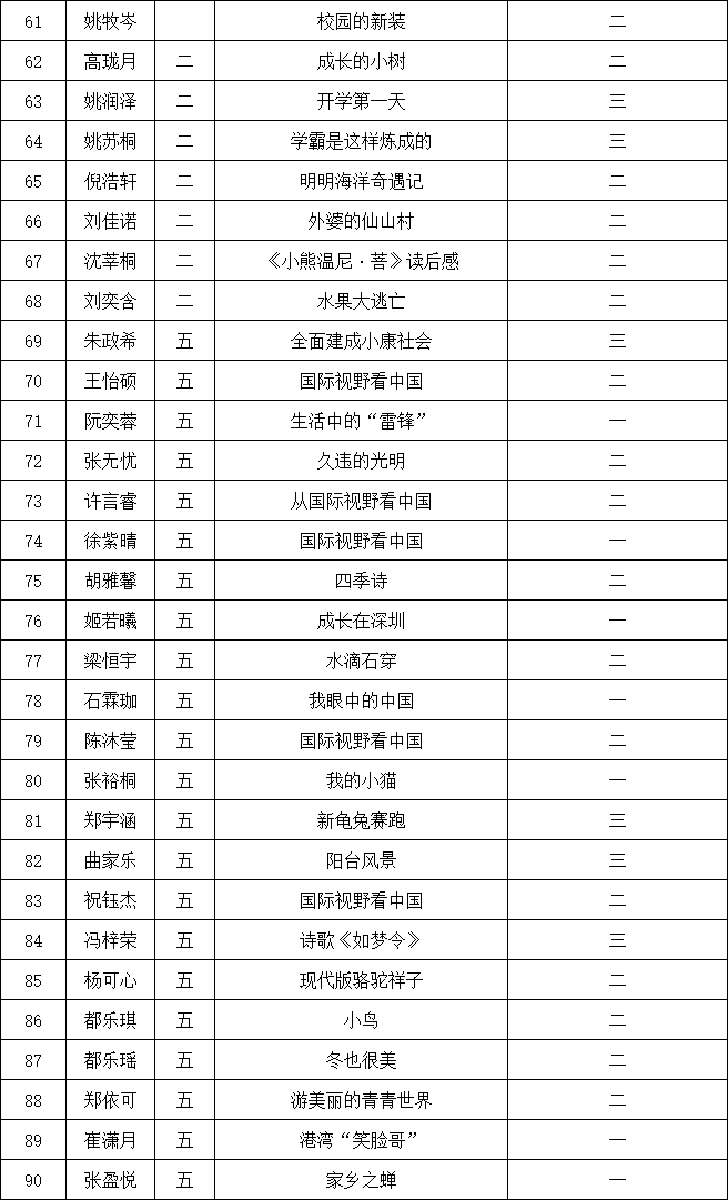 自2021年1月,活動(dòng)征稿啟動(dòng)以來,獲得了深圳市廣大中小學(xué)生、教師、文學(xué)愛好者的熱烈響應(yīng)積極參與,吸引了深圳百余所學(xué)校的上萬人關(guān)注報(bào)名?,F(xiàn)公布南山實(shí)驗(yàn)教育集團(tuán)前海港灣學(xué)校校園專場晉級(jí)復(fù)賽名單如下: