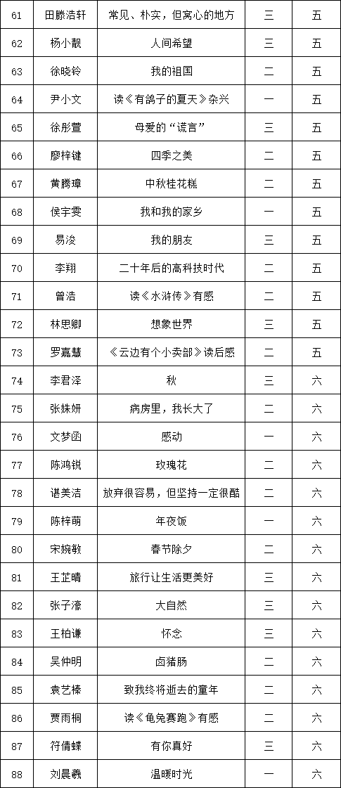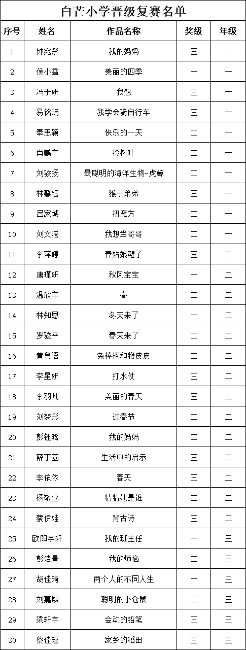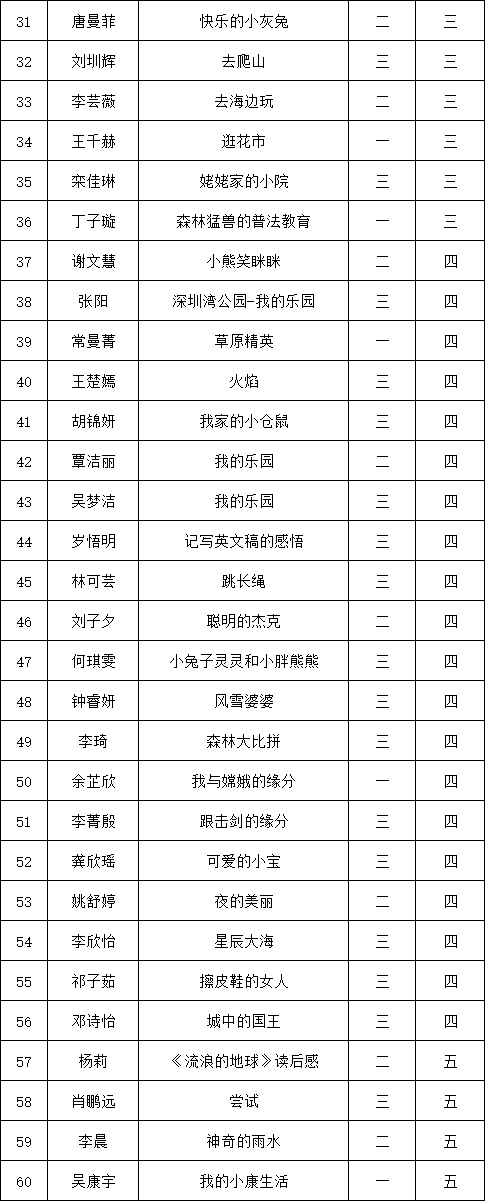 自2021年1月,活動(dòng)征稿啟動(dòng)以來,獲得了深圳市廣大中小學(xué)生、教師、文學(xué)愛好者的熱烈響應(yīng)積極參與,吸引了深圳百余所學(xué)校的上萬人關(guān)注報(bào)名?,F(xiàn)公布深圳市南山實(shí)驗(yàn)教育集團(tuán)白芒小學(xué)專場晉級復(fù)賽名單如下: