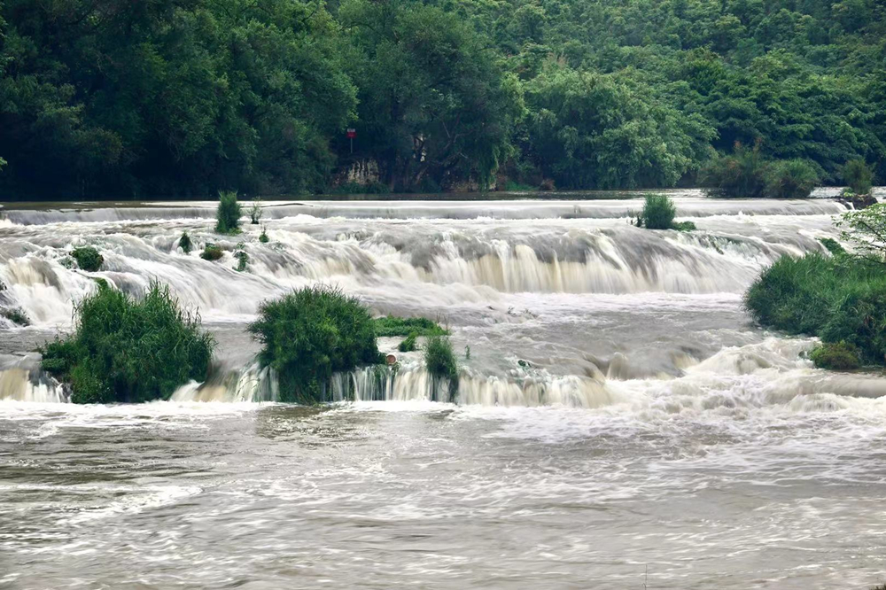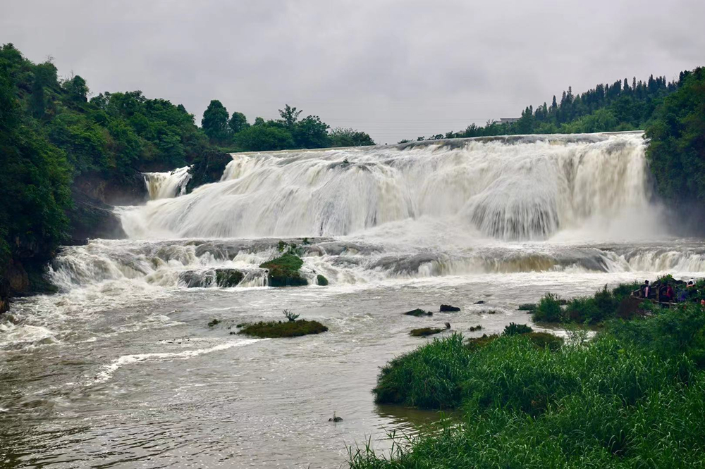 陡坡塘瀑布位于黃果樹瀑布上游1公里處,瀑頂寬105米,高21米,是黃果樹瀑布群中瀑頂最寬的瀑布。李仁奇 攝