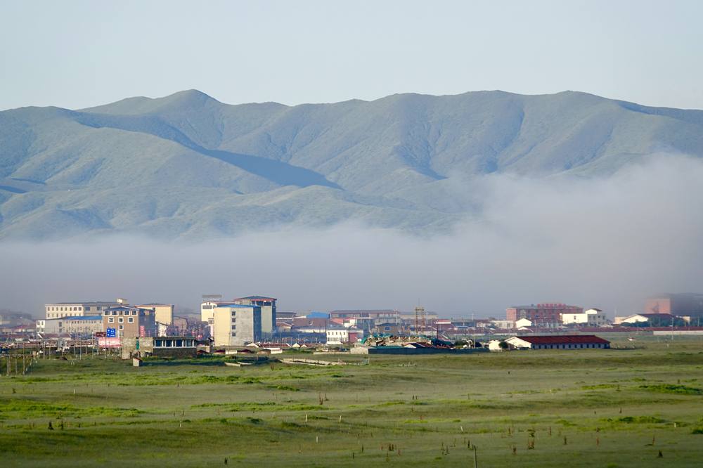 往白河方向遠(yuǎn)眺,群山煙霧繚繞,如夢(mèng)似幻;山下索克藏寺,沐浴晨光。航拍圖,郭國政 攝