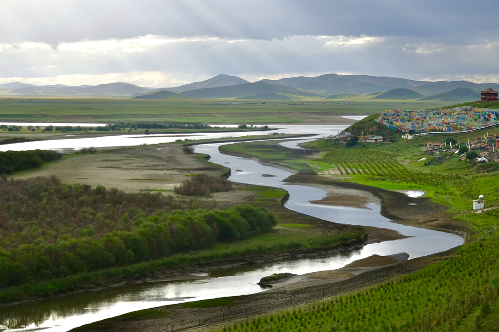 黃河的這一段流程是四川與甘肅的界河,河西為甘肅,河?xùn)|為四川。黃河自甘肅一側(cè)來,白河自黃河第一灣灣頂匯入,型如“S”型,黃河之水猶如仙女的飄帶從天邊緩緩飄來,在四川邊上輕輕撫了一下又轉(zhuǎn)身飄回青海,故此地稱九曲黃河第一灣。李仁奇 攝