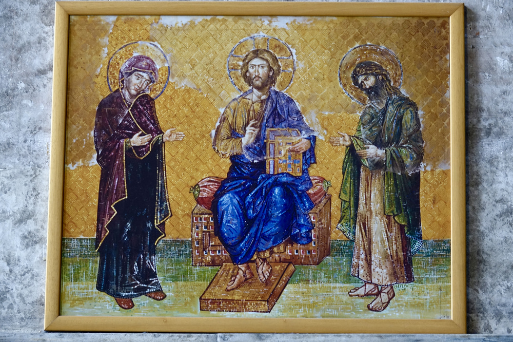 馬賽克《三圣像》,畫(huà)面下方已經(jīng)被嚴(yán)重?fù)p毀,但仍然能看到中央的耶穌基督,其兩側(cè)是圣母瑪利亞和施洗者約翰。李仁奇 攝