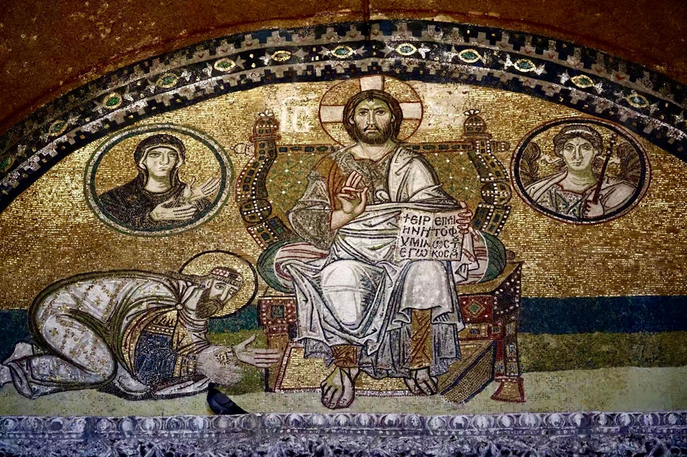 鑲嵌畫(huà)《全能的耶穌》。坐在寶座上的耶穌左手握著福音書(shū),上面用希臘文寫(xiě)著:“賜予汝和平,我世界之光”。耶穌左邊是圣母瑪利亞,右邊是大天使,當(dāng)時(shí)的羅馬皇帝虔誠(chéng)的匍匐在耶穌面前。李仁奇 攝