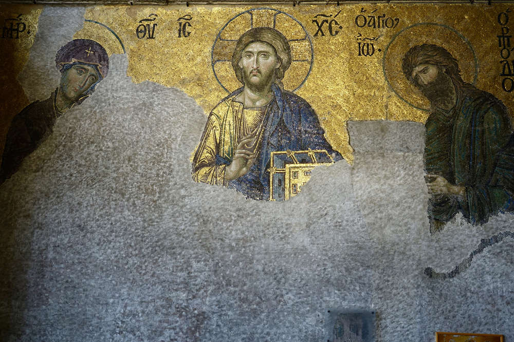 1935年,第一任土耳其總統(tǒng)、土耳其國(guó)父穆斯塔法·凱末爾·阿塔圖爾克下令將圣索菲亞大教堂變?yōu)椴┪镳^。覆蓋在鑲嵌畫(huà)上的灰漿由專家煞費(fèi)苦心地擦去,地面飾品得以展示。改名后的阿亞索菲拉博物館實(shí)際上的展品主要就是建筑物自身以及其中的鑲嵌畫(huà)藝術(shù)品。李仁奇 攝