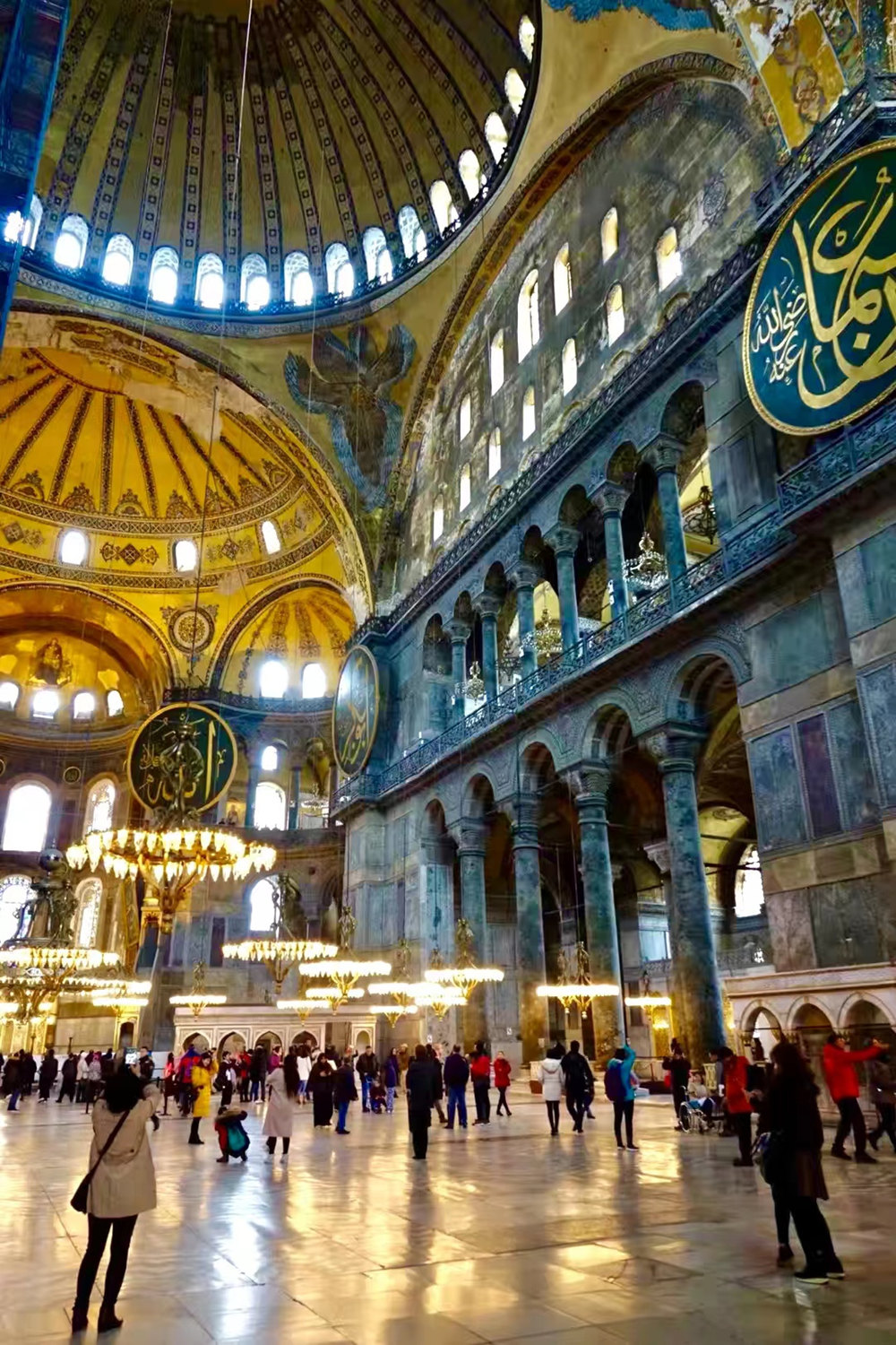 大堂里懸掛著巨大的金字圓牌,上面刻寫(xiě)著真主、先知默罕默德、前四位哈里發(fā)以及穆罕默德兩個(gè)孫子的名字,出自?shī)W斯曼詩(shī)人兼書(shū)法家厄芬迪的手筆,至今仍然吸引著游客們的目光。李仁奇 攝