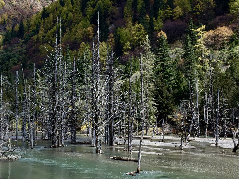 枯樹(shù)灘,因地質(zhì)災(zāi)害導(dǎo)致河流改道,淹沒(méi)大片原始樹(shù)木,雜木鈣化后留下一片樹(shù)樁置于河灘,故稱(chēng)“枯樹(shù)灘”。李仁奇 攝