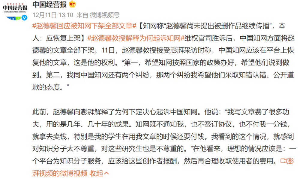 法學(xué)教授勝訴后論文被下架 趙德鑫:中國(guó)知網(wǎng)必須改革