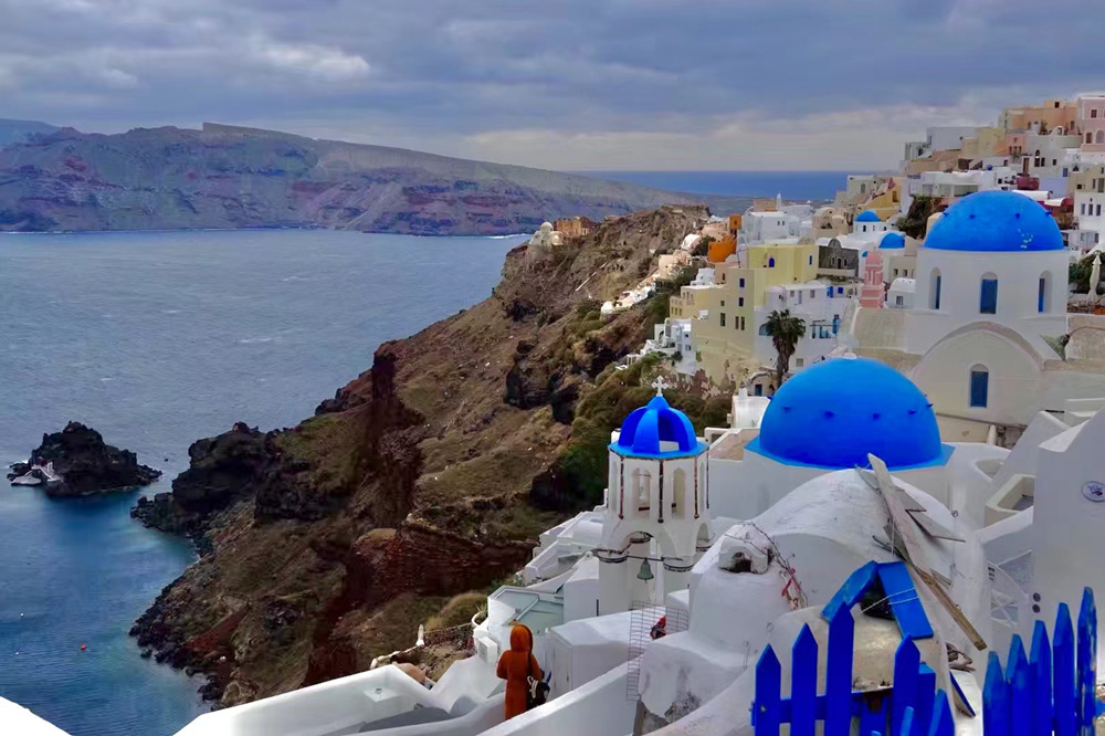小鎮(zhèn)上依山而建的白色房屋,藍色穹頂,其間還點綴著紅、黃、粉以及無數(shù)種漸變的顏色,錯落有致。李仁奇 攝
