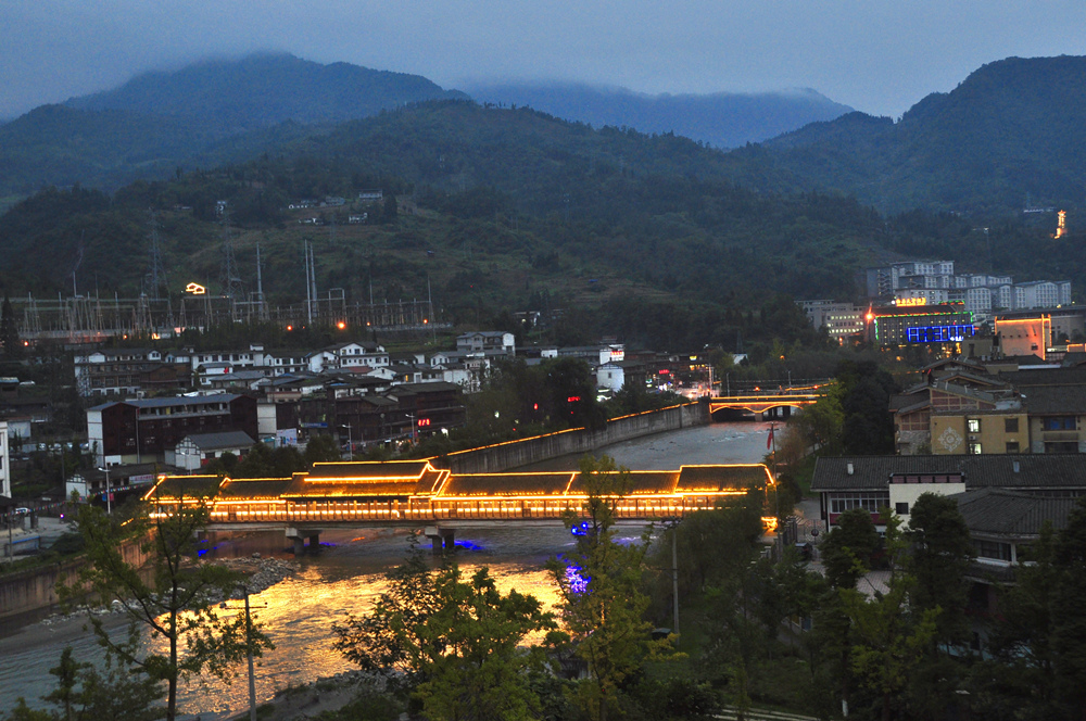 禪城橋是水磨古鎮(zhèn)災(zāi)后重建的一座步行橋,2009年9月開(kāi)工,2010年1月竣工。主體采用預(yù)制小箱梁簡(jiǎn)支梁橋,上部為木結(jié)構(gòu)長(zhǎng)廊,造型獨(dú)特,韻味古典。李仁奇 攝