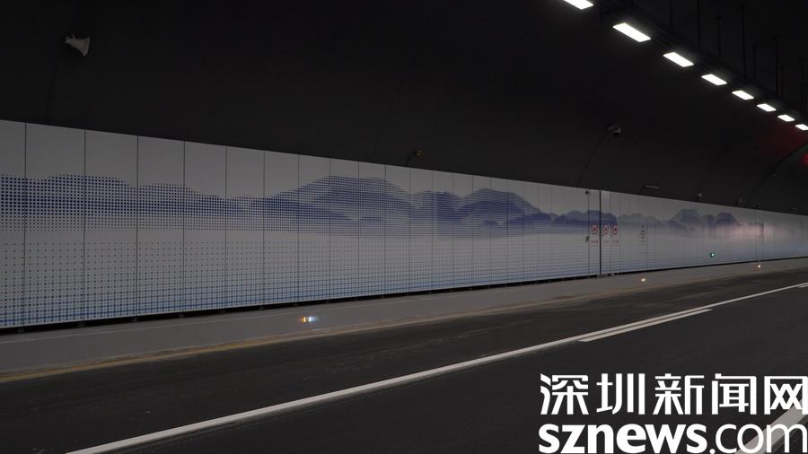 到達(dá)隧道的中段部分,映入記者眼簾的是一道道彩色的燈帶,這些燈帶可以根據(jù)環(huán)境光變換成七種不同的顏色,可謂科技感十足。在即將駛出隧道口200米處,我們能看采用彩色絲印搪瓷鋼板呈現(xiàn)的坪山地貌風(fēng)光、鹽田山海風(fēng)光,這意味著,我們穿過了馬巒山的山體,一下子從坪山來到了鹽田區(qū)范圍內(nèi)的惠深沿海高速,這趟坪山到鹽田的隧道之旅僅僅不到10分鐘就要結(jié)束了。