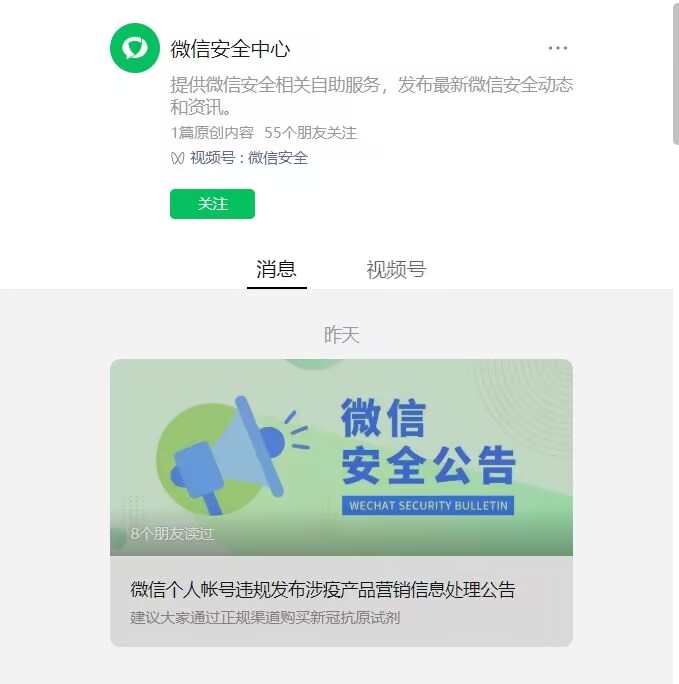 最新消息:微信安全中心12月21日發(fā)布《微信個(gè)人帳號(hào)違規(guī)發(fā)布涉疫產(chǎn)品營(yíng)銷信息處理公告》。公告中提到,“我們通過用戶投訴發(fā)現(xiàn),少數(shù)用戶利用微信的功能發(fā)布抗原試劑檢測(cè)盒和退燒藥等各類藥品的營(yíng)銷信息,其中不乏有人哄抬價(jià)格,甚至存在欺詐行為,給用戶的生命健康安全造成了一定的威脅。”