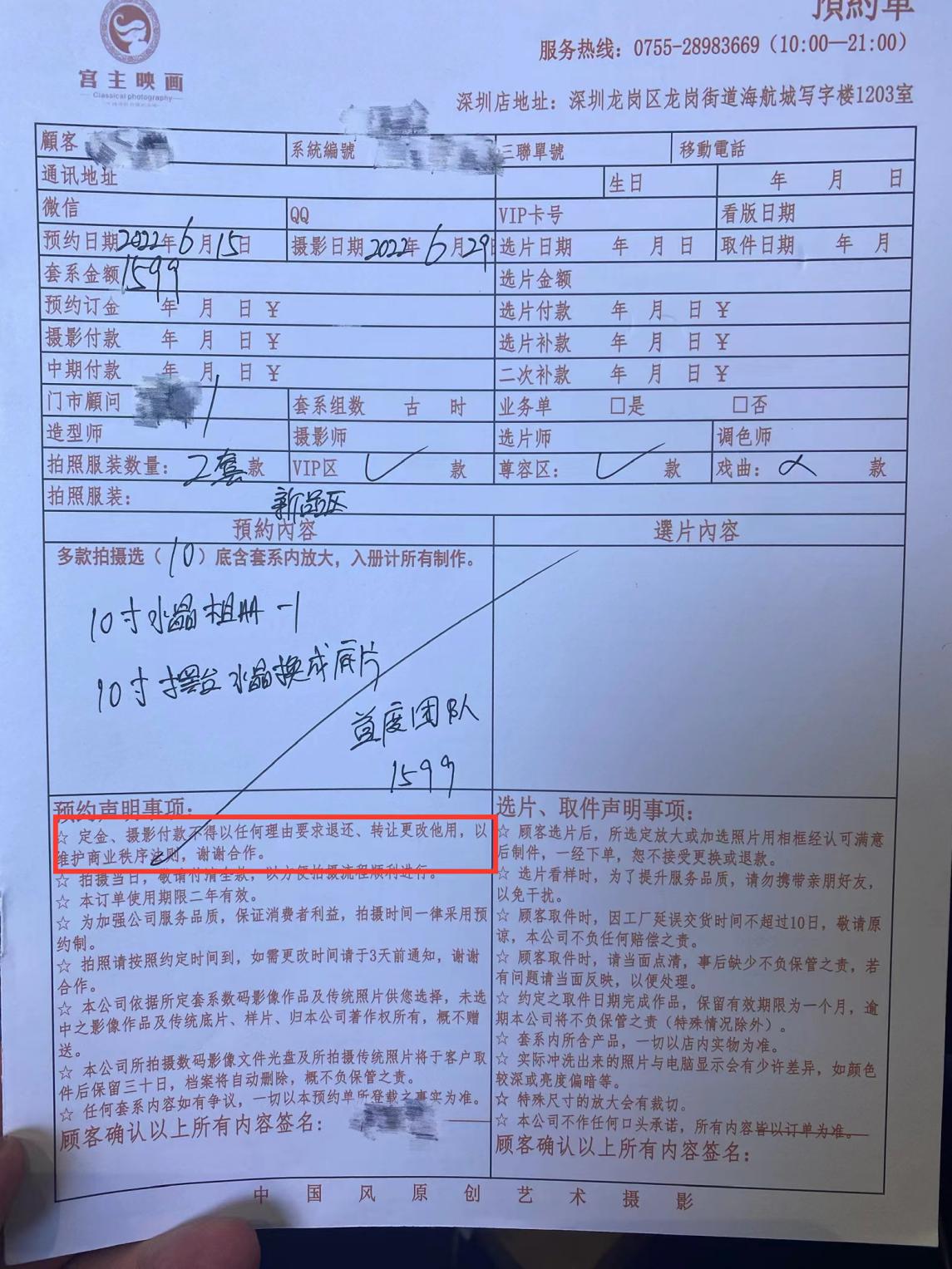 本人于2022年6月15日在該商家處支付了1599元購買寫真拍攝服務(wù),購買后因故離開深圳,無法繼續(xù)消費,故要求退還預(yù)付款。