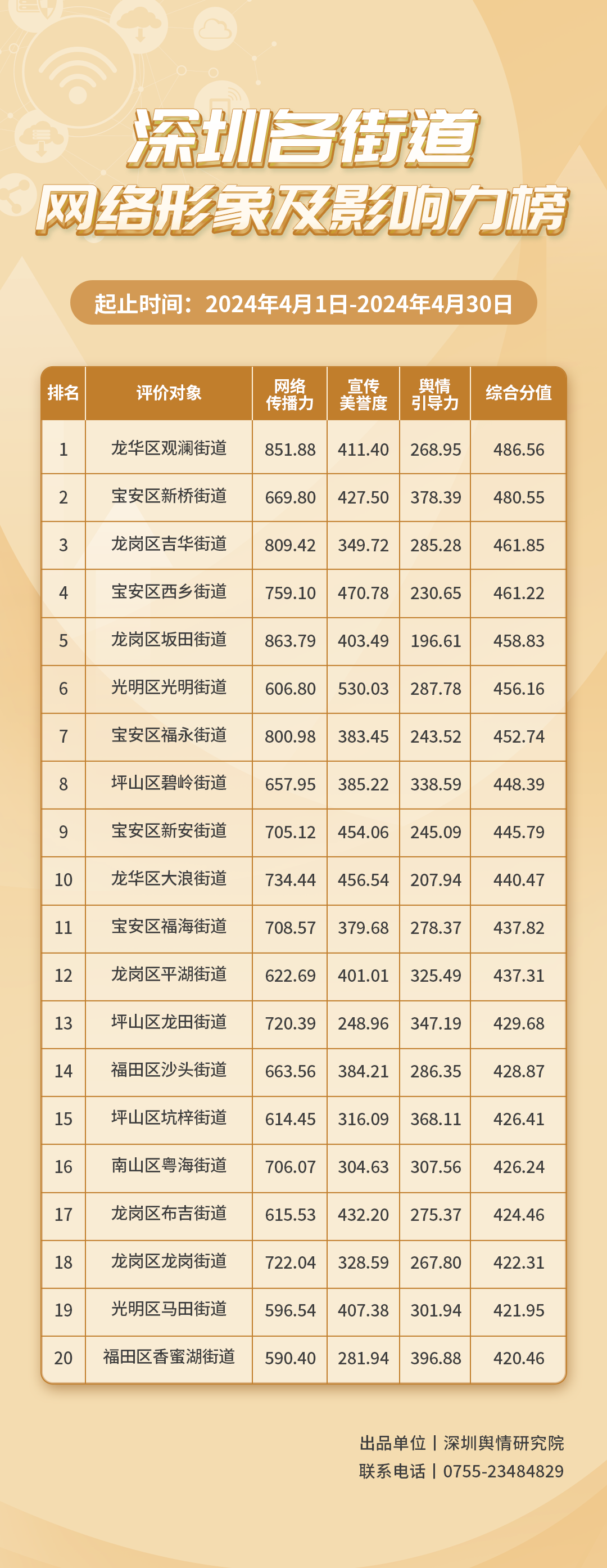 2024年4月,深圳市哪些街道在網(wǎng)絡(luò)形象及影響力塑造方面表現(xiàn)甚佳?讓我們共同關(guān)注。本期榜單數(shù)據(jù)統(tǒng)計范圍為2024年4月1日至4月30日。