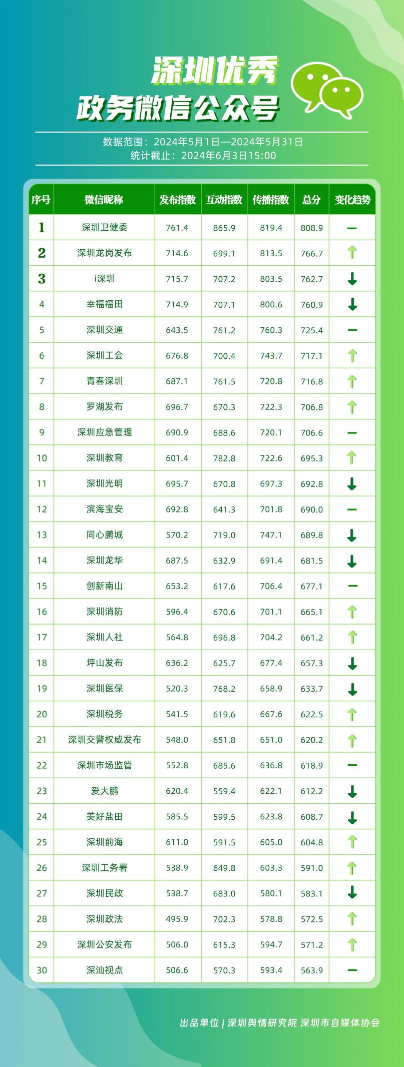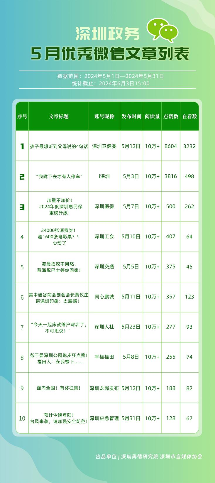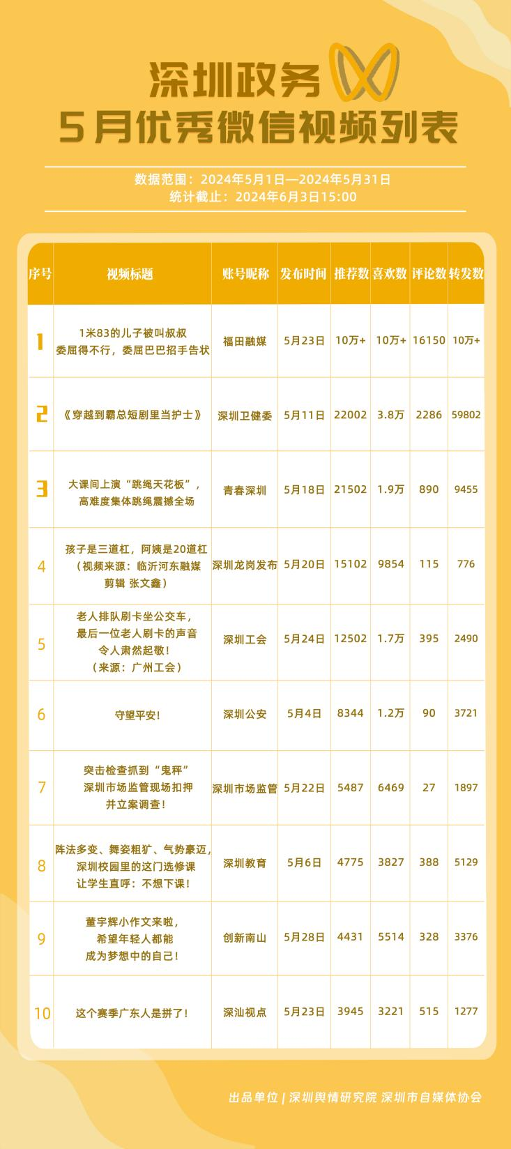 5月,“深圳衛(wèi)健委”“深圳龍崗發(fā)布”“i深圳”“幸福福田”“深圳交通”“深圳工會(huì)”“青春深圳”“羅湖發(fā)布”“深圳應(yīng)急管理”“深圳教育”等30個(gè)政務(wù)微信公眾號(hào),被評(píng)為“深圳優(yōu)秀政務(wù)微信公眾號(hào)”。5月,“深圳衛(wèi)健委”憑借精心創(chuàng)作的內(nèi)容、與受眾深入互動(dòng),多篇作品深受好評(píng),榮登榜單首位?!吧钲邶垗彴l(fā)布”“i深圳”“幸福福田”“深圳交通”等上榜公眾號(hào)也積極捕捉觀眾優(yōu)質(zhì)作品需求,把握主流熱點(diǎn)趨勢(shì),集中發(fā)揮政務(wù)媒體傳播力量,在本期也取得了較為亮眼的成績,進(jìn)一步推動(dòng)了政務(wù)信息傳播工作提質(zhì)增效。
